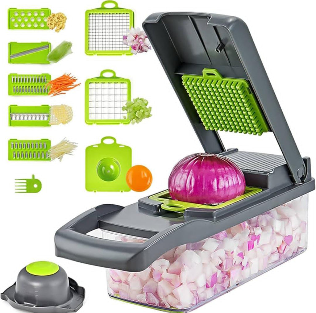 Coupe-légumes multifonction avec lames interchangeables, idéal pour couper, trancher et râper rapidement les légumes. Bac de récupération inclus pour une cuisine propre et pratique.