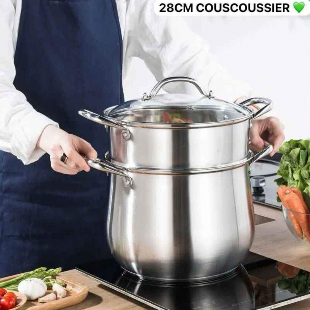 Un couscoussier de 28 cm est un ustensile de cuisine spécialement conçu pour la préparation du couscous, mais aussi d'autres plats cuits à la vapeur. Voici ses principales caractéristiques :