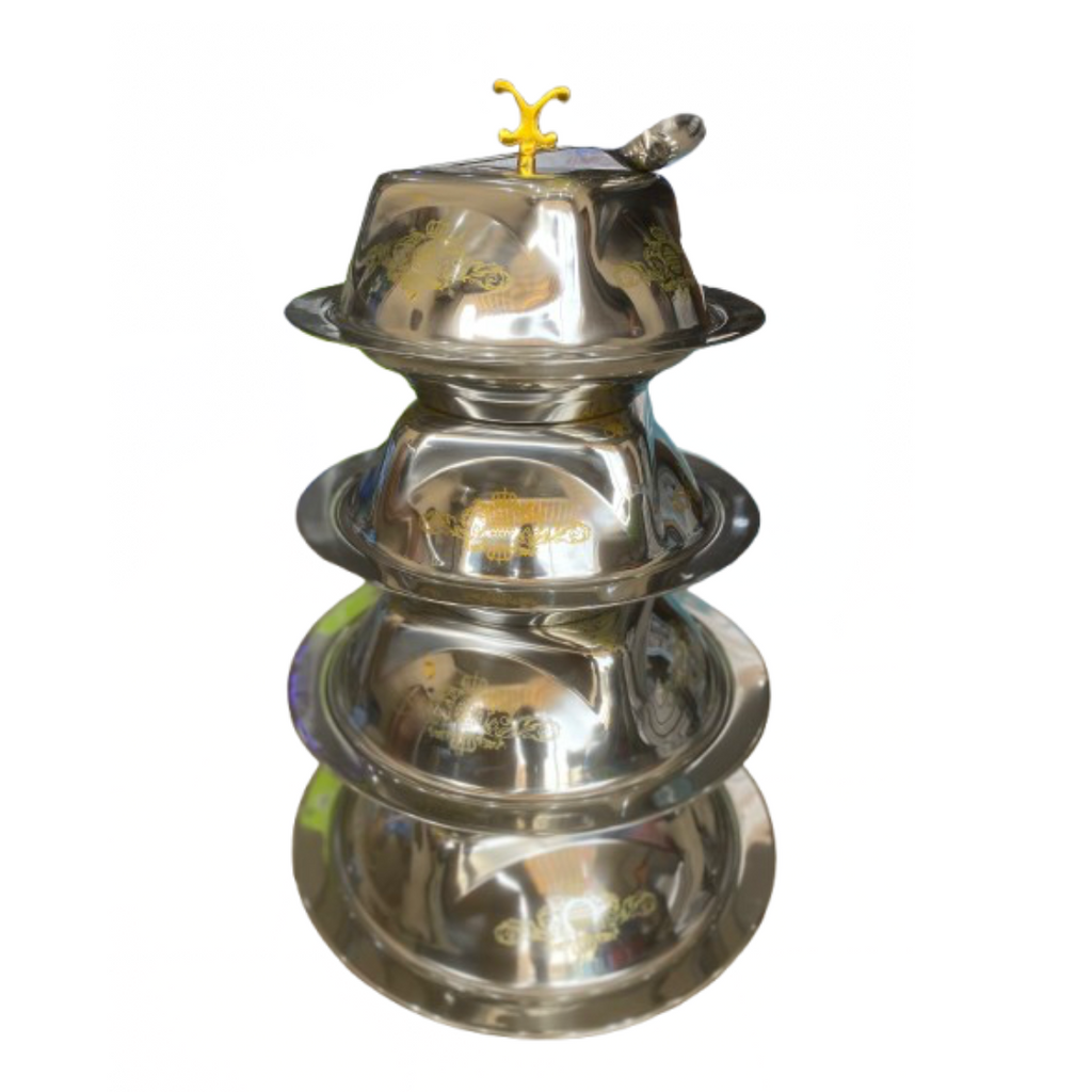 Découvrez cet ensemble de 4 bols Zam Zam en inox, Parfait avec couvercles dorés