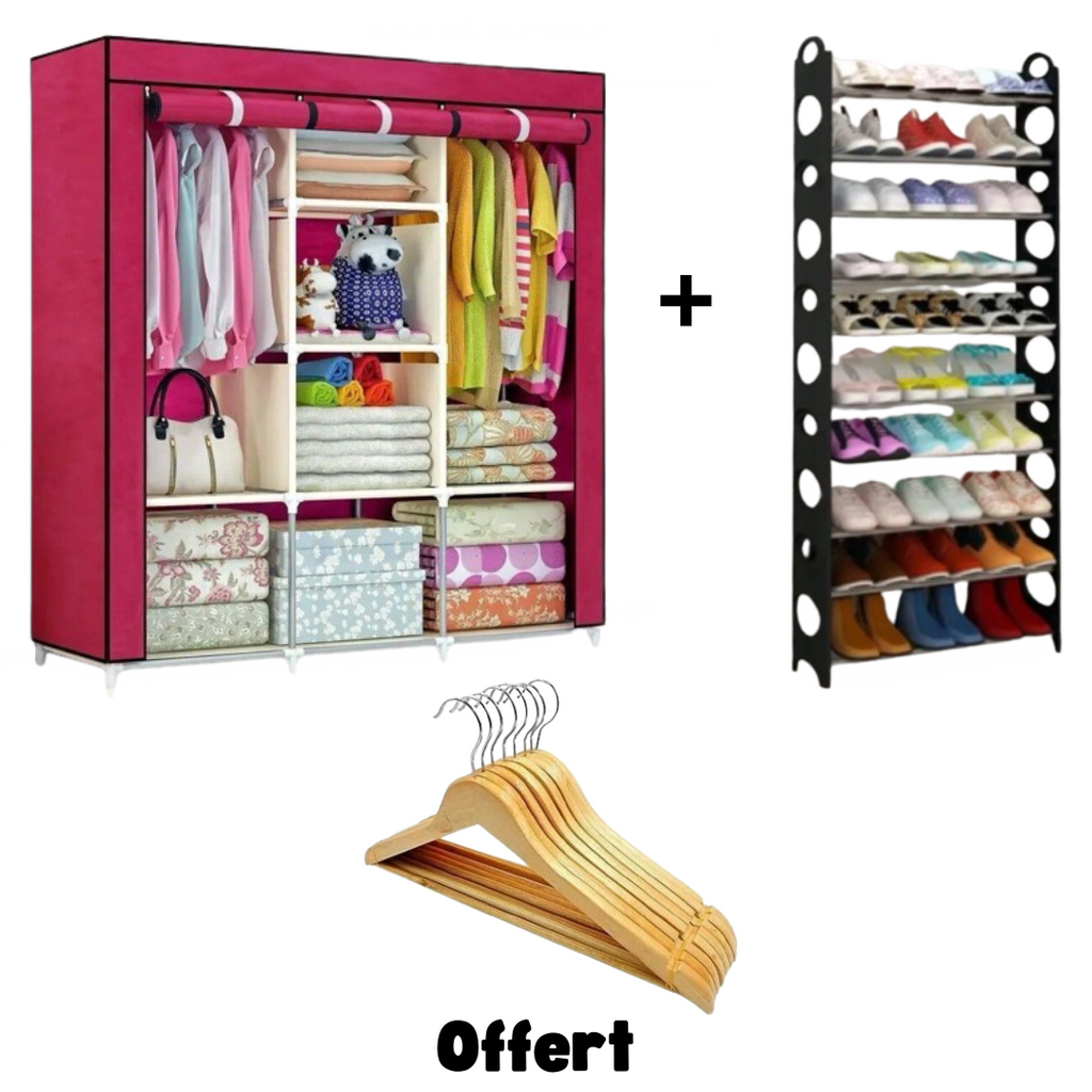 Pack armoire 3 battants en housse plus range chaussure 10 etagères plus 6 cintre en bois offert.