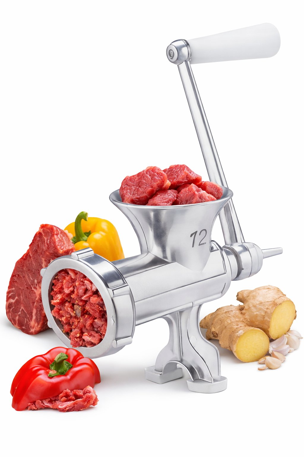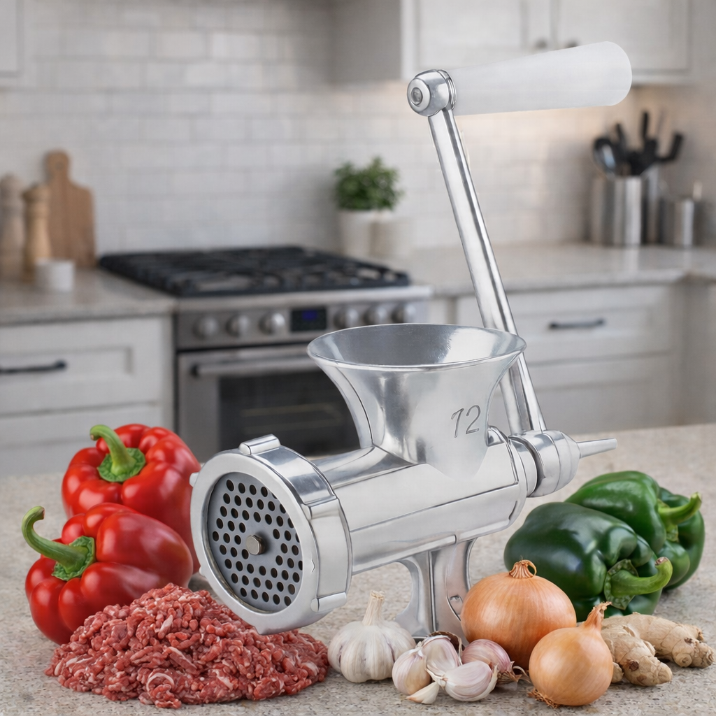 Hachoir manuel en acier inoxydable, robuste et facile à utiliser, idéal pour hacher viande, légumes, ail, oignon et gingembre en toute simplicité.