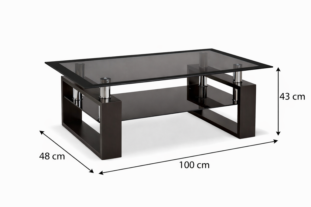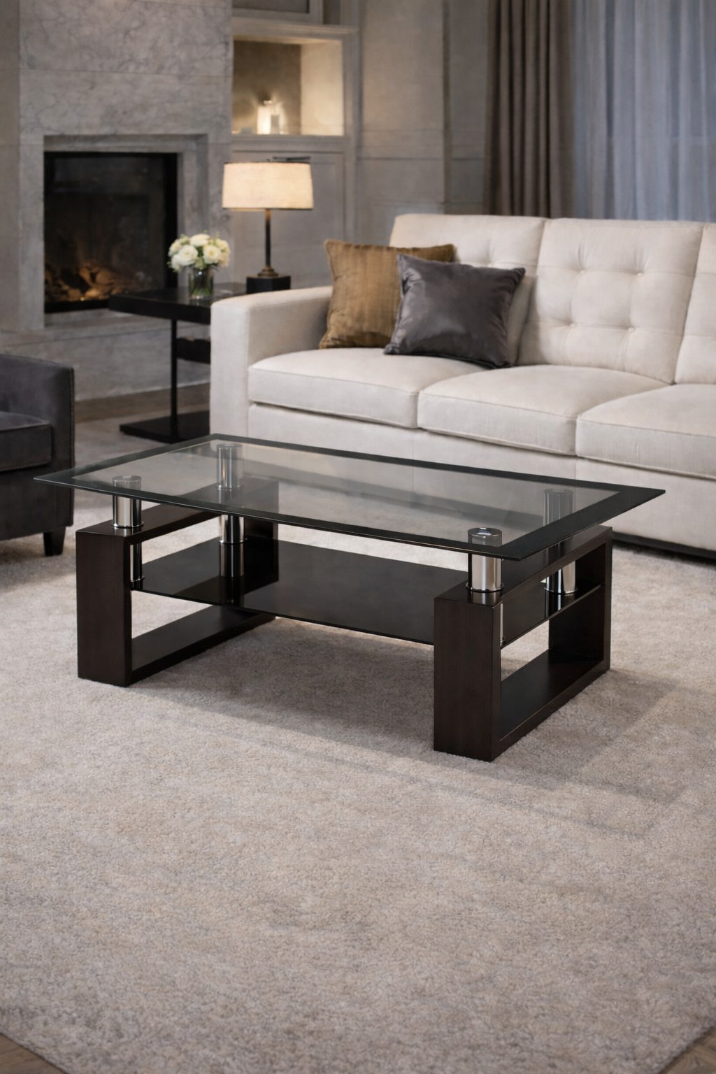 Table basse moderne avec plateau en verre et structure en bois solide, idéale pour apporter élégance et style à votre salon.