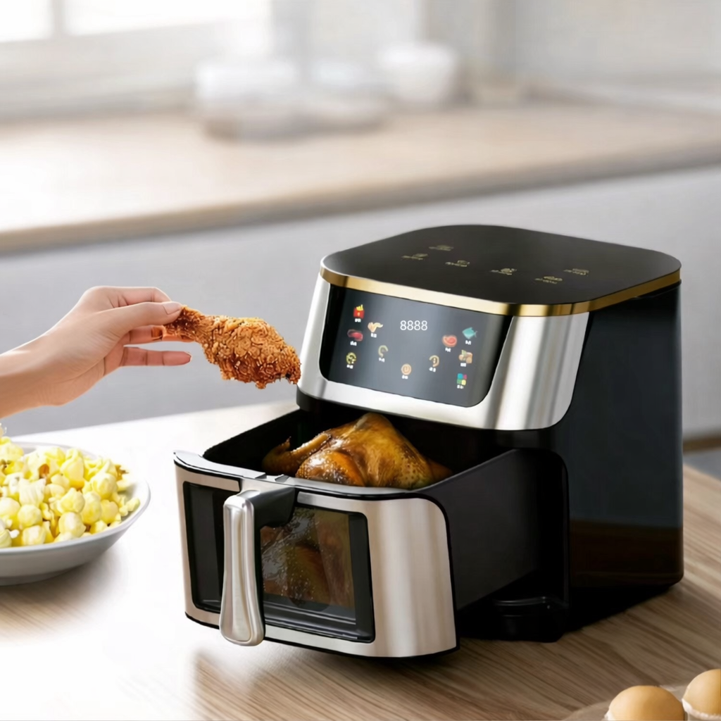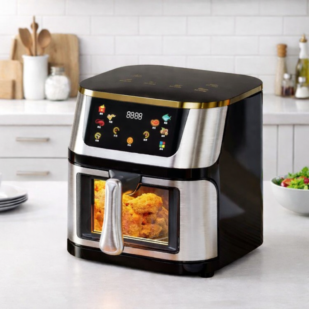 Air Frayeur, friteuse sans huile digitale avec écran tactile et fenêtre transparente pour surveiller la cuisson. Cuisinez rapidement des plats croustillants et savoureux avec peu ou pas d’huile — idéale pour frites, poulet, poisson et snacks sains au quotidien.